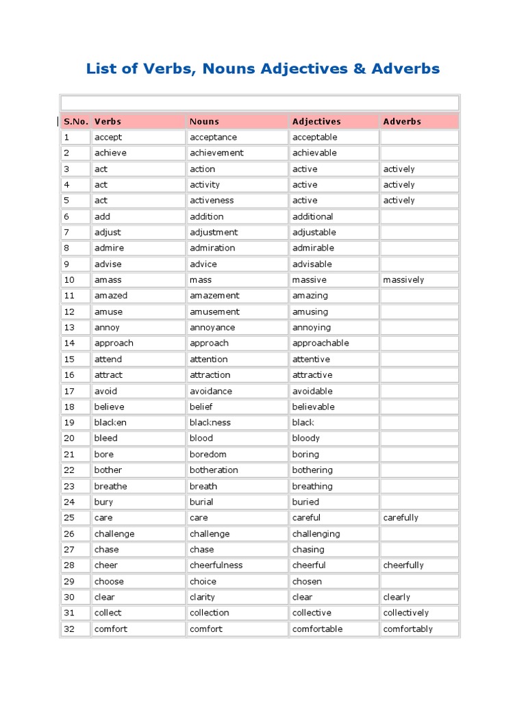 In most languages, there are nouns, adjectives, verbs and adverbs, which can be part of either a simple or complex sentence to portray a thought or idea or various thoughts and ideas. Documents similar to 50 nouns, adjectives and adverbs list. List of verbs, nouns, adjectives, and adverbs Definitions & notes only words. Knowing your adverbs will give you the opportunity to inject more description into your.